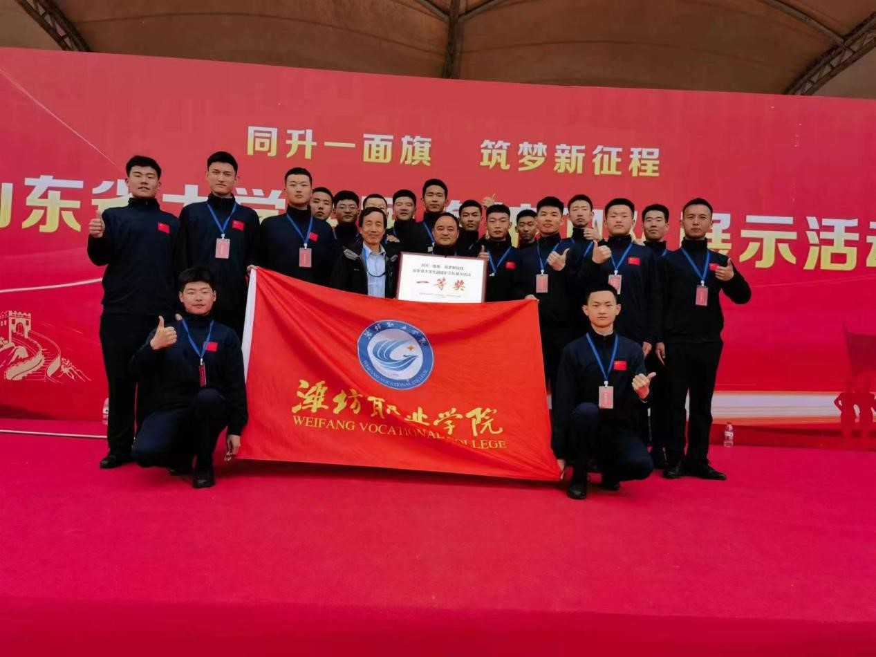 “同升一面旗 筑梦新征程”山东省大学生国旗护卫队展示活动是由中共山东省委宣传部、省教育厅、省军区政治工作局联合主办,山东省学校国防教育协会、临沂大学、临沂市青少年示范性综合实践基地承办的全省各高校国旗护卫队展示比赛活动。经过视频初赛和现场复赛,我院国旗护卫队在全省136所高校中脱颖而出,成功斩获团体一等奖的好成绩。学院联合组建了赛事工作组,积极备训、争先创优,从训练、服装、行程、保障等各个方面细致规划、精心安排,国旗护卫队全体人员经过近一个月的刻苦训练、努力拼搏,与全省40家高校同台竞技、勇夺桂冠,展现了潍职学子的卓越风采和精神面貌。