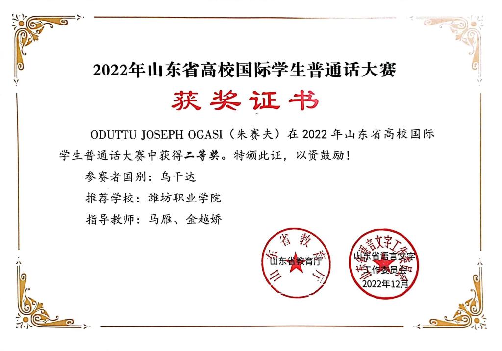 为促进学生全面发展,我院积极组织国际学生参加国际国内多层次多领域比赛。国际学生在多项比赛中荣获佳绩。乌干达籍学生参加2022年山东省高校国际学生普通话大赛获得二等奖,参加2022年山东省中华经典诵读比赛获得三等奖,参加首届世界职业院校技能大赛增材制造赛获得第四名。乌兹别克斯坦、塔吉克斯坦籍学生的两个作品《<论语>经典大家诵儒家文化世界传》和《诵读<论语>明理做人》入选2021儒家经典跨语言诵读大会优秀作品,被收录到《向世界讲好中国故事》一书,由青岛出版社出版。