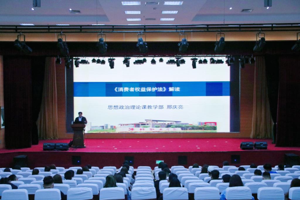在第39个国际消费者权益日到来之际,为增强大学生法治观念和依法维权意识,3月15日晚上,学校在滨海校区图书馆报告厅和奎文校区16号楼报告厅通过视频连线方式举办“3.15”消费者权益保护专题报告。思想政治理论课教学部主任邢庆亮作消费者权益保护专题报告,青年法学社和同学代表共350余人参加报告会。
