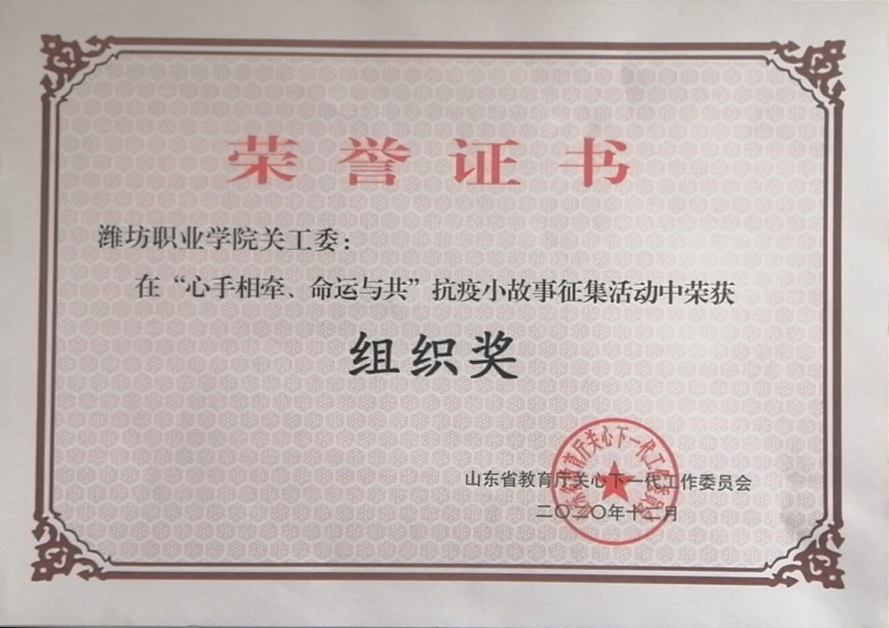 近日,山东省教育厅关心下一代工作委员会等三部门公布了“心手相连、命运与共”抗疫小故事征集活动获奖名单。其中,全省高职院校评选出一等奖4个。我校图书馆孙东梅老师的作品荣获一等奖,汽车工程学院李庆敏老师和国际交流与合作处付正老师的作品荣获三等奖。我校同时被评为组织奖。