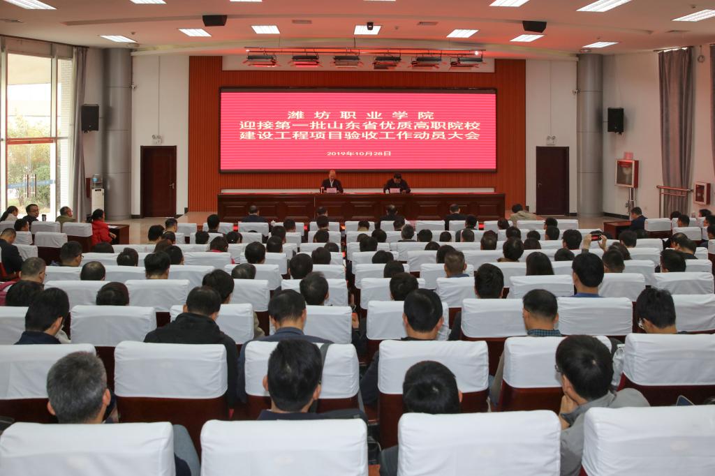 为全面推进优质校建设,做好优质校建设成效总结,以优异成绩迎接山东省教育厅对我院优质校建设的验收,10月28日下午,学院在滨海校区清泽楼报告厅召开迎接山东省优质高职院校验收工作动员大会。学院领导马跃启、王家爱、宋桂言、贺志强、李瑞昌、郭晓辉、刘德强出席。各部门、二级学院党政主要负责人,副科级以上干部,正高级职称教师,博士,各重点建设项目组骨干成员,优质校建设办公室全体成员200余人参加会议。