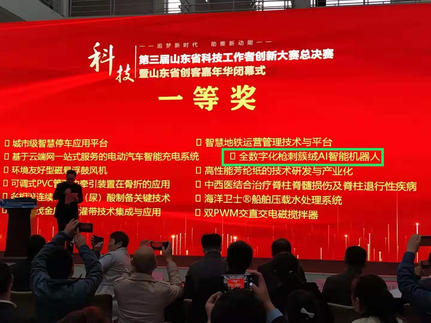 2019年山东省“创客嘉年华“暨第三届山东省科技工作者创新大赛决赛于10月25日在日照职业学院举办,由我院辛海明老师主持,联合山东省工业和信息化研究院申报的“全数字化枪刺簇绒AI智能机器人“项目荣获大赛一等奖。我院是全省唯一一所荣获一等奖的高职院校,实现我院在该赛项上的新突破。