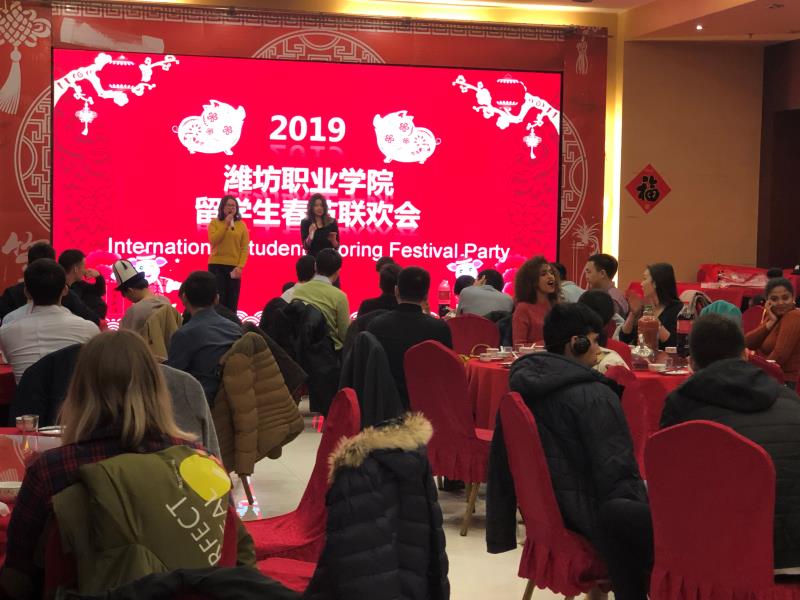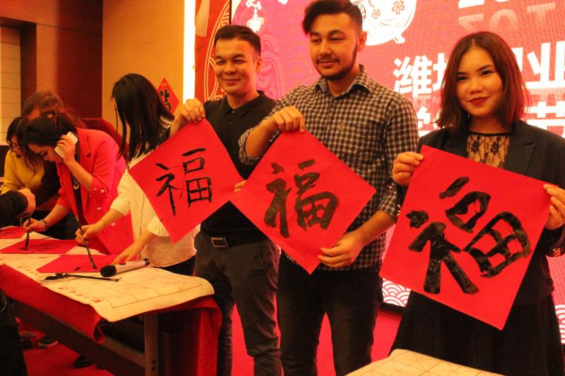 谭明致辞,代表学院向外籍教师及留学生们送上了新春祝福和学院领导的关怀。联欢会现场春联、福字、贴花将活动大厅装扮得极富中国年味。晚会播放了留学生们在潍职学习生活视频集锦,回顾了他们来潍职近半年学习生活的点点滴滴和精彩瞬间。联欢会组织了丰富多彩的歌舞表演、你来比划我来猜汉字比赛、抽奖互动小游戏等,在老师的指导下,同学们用毛笔临摹了寓意吉祥幸福的“福”字贴,大家载歌载舞,品尝具有中国特色的美食--饺子等,全场洋溢着欢乐祥和的节日氛围。活动中学生们争相拍照留念,并将精彩瞬间发给遥远的亲朋好友,传达了他们在中国潍坊职业学院平安快乐的学习和生活情况。本次活动留学生们亲身体验了中国最重要的节日-春节的文化习俗,成为在华留学难忘的记忆,留学生们对学院周到安排深表谢意。