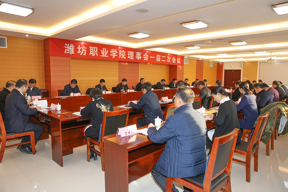 12月19日上午,潍坊职业学院理事会一届二次会议在学院滨海校区隆重召开。理事会理事长、学院党委书记张洪全,常务副理事长、学院院长王家爱,副理事长、潍坊市经济和改革委员会副主任董连文,以及潍坊市经济和信息化委员会党委副书记王春国、潍坊市科技局调研员丁映、潍坊市委教育工委副书记李广敬、潍坊市农业科学院院长赵建武、中国建设银行潍坊分行副行长程刚、潍坊银行总行营业部总经理李宪义、潍坊软件园服务中心主任董玉伦、潍坊滨海经济技术开发区社会事业局党委书记、局长张英杰,以及来自合作企业、学院相关部门的理事和代表37人参加了会议。会议由理事会秘书长、学院副院长赵君堂主持。