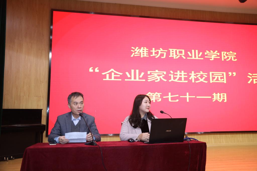12月19日下午,学院第七十一次“企业家进校园”活动在奎文校区16号楼报告厅举行,潍坊奎文门文化运营管理有限公司总经理、潍坊潍物文化传播有限公司运营总监欧阳,作了主题为“文创,是艺术,也是生活”的讲座。文化创意学院师生300余人参加了报告会。