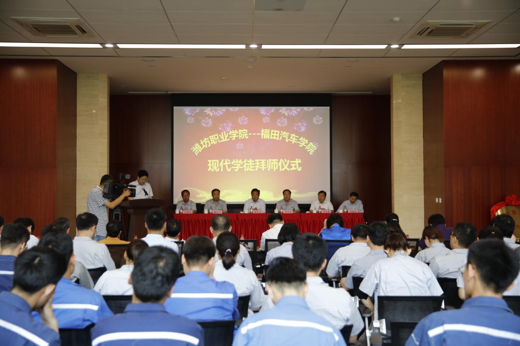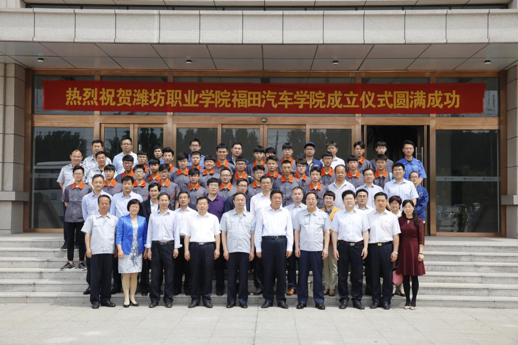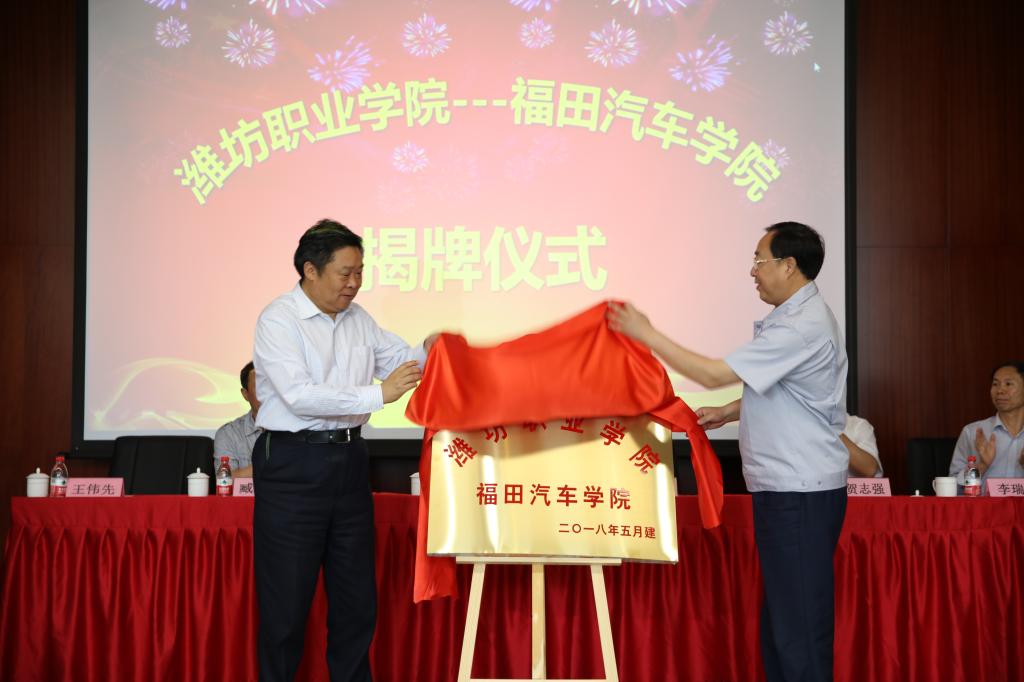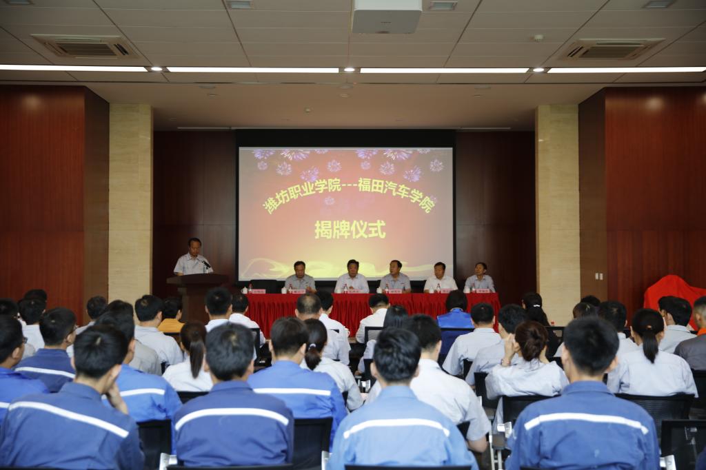 5月25日上午,潍坊职业学院福田汽车学院成立仪式在福田多功能汽车厂潍坊厂区学术报告厅举行。学院党委书记张洪全,福田商用车集团副总裁钟明华,学院副院长贺志强、李瑞昌,福田多功能汽车厂潍坊厂区党委书记臧运宁等校企领导、学院相关职能部门、二级学院负责人及学院学生代表、企业职工代表参加了成立仪式。张洪全与钟明华共同为潍坊职业学院福田汽车学院揭牌。福田潍坊厂区党委常务副书记王伟先主持仪式。