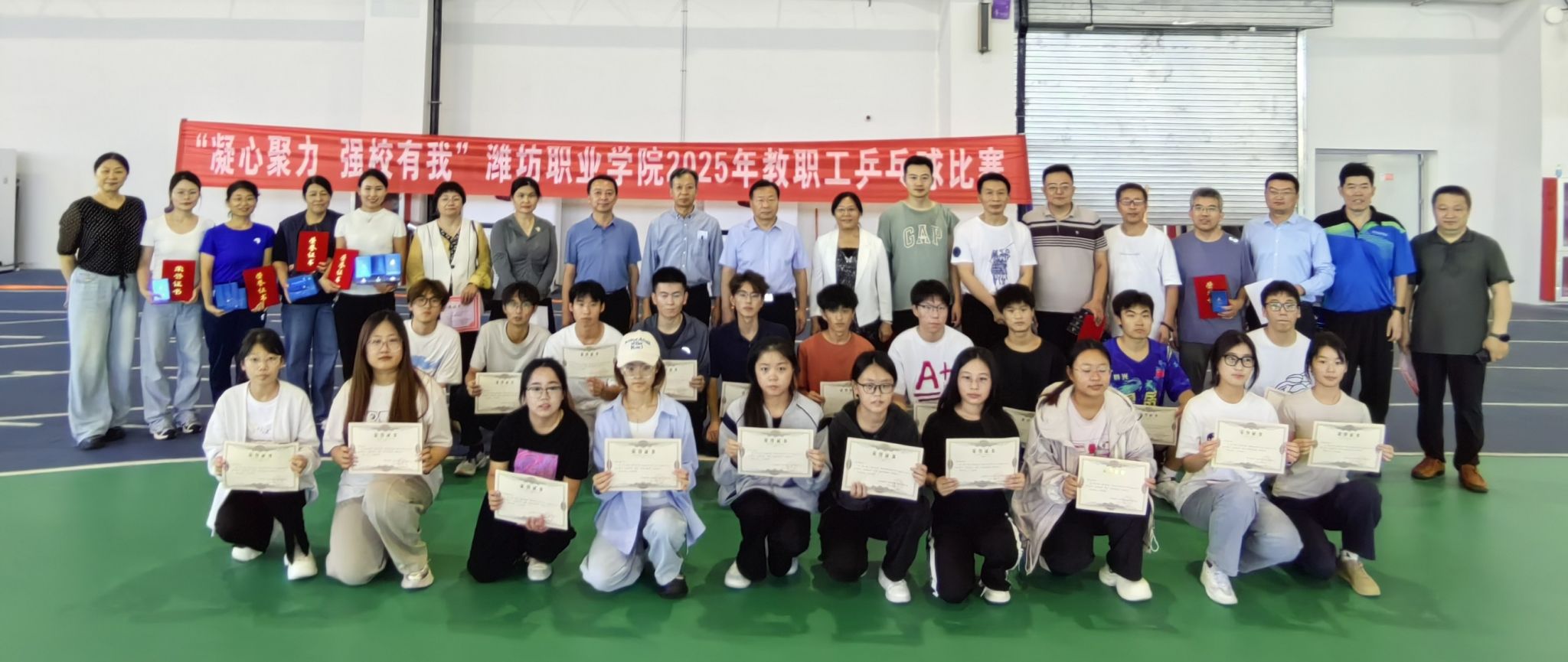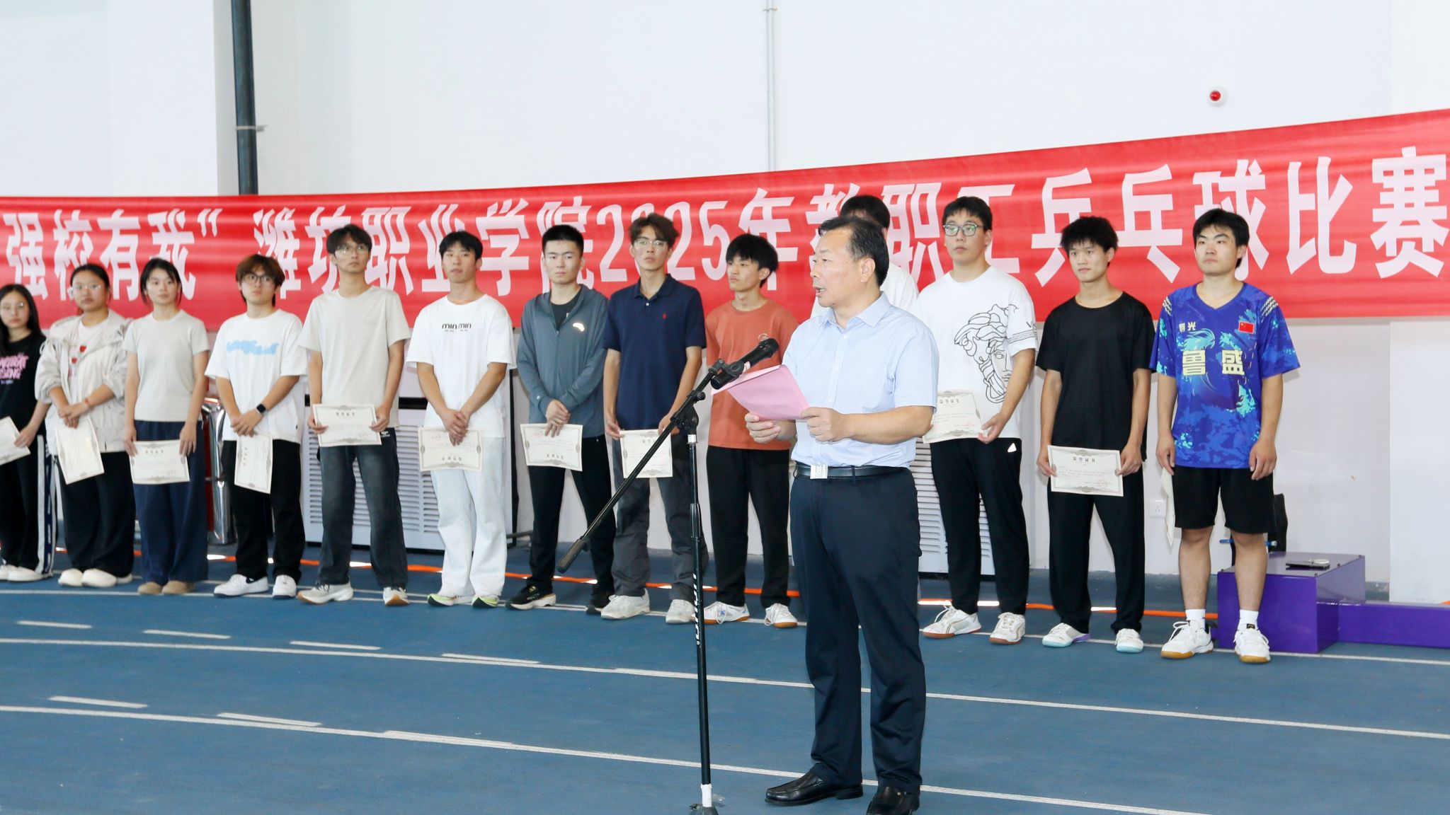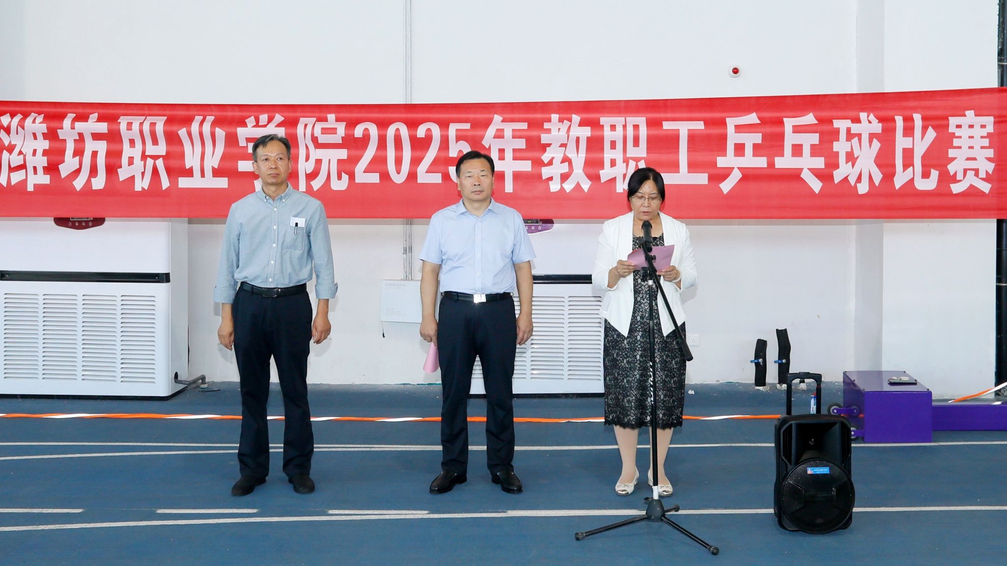 9月22日至25日,“凝心聚力,强校有我”潍坊职业学院教职工乒乓球比赛在滨海校区竞泽广场举行。学院党委书记王浩为比赛开幕致辞并宣布比赛开幕,党委副书记贺志强致闭幕辞并为获奖运动员颁奖,党委委员高凌云主持比赛开幕式和闭幕式。