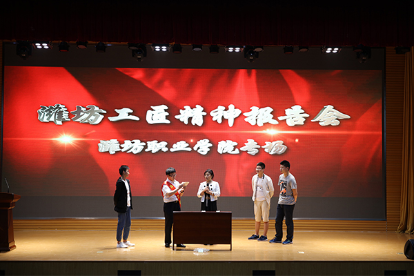 报告团由市委宣传部、市总工会、潍坊日报社、潍坊电视台选取各行各业优秀的工匠代表组成。来我院作报告的韩龙吉(国网昌乐县供电公司配电运维班班长)、孙秀平(山东美晨科技股份有限公司模具设备工)、李英杰(潍柴动力股份有限公司一号工厂设备维修工)、庄明明(盛瑞科技股份有限公司8AT零部件生产车间工段长)、荆红强(潍坊银行青州金鼎支行大堂经理)、曹炳吉(山东豪迈机械科技股份有限公司改善专员)等6名工匠,是由潍坊市总工会经过为期半年的时间从全市100名能工巧匠中评选出的优秀工人代表。